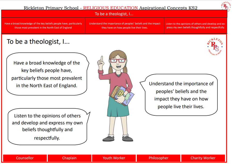 At Rickleton Primary, we follow the local SACRE RE curriculum. This is designed to support the needs of the local community and is tailored towards ensuring that the knowledge children gain is relevant to the context of living in the North East of England. The document below shows the progression of topics and teaching that children will encounter across their time in school.