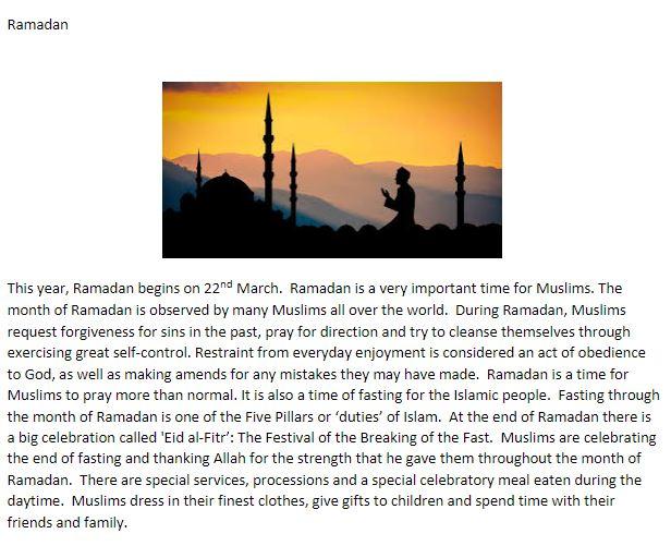 As part of our RE, we want to make our children and families more aware of other religions as part of our focus on understanding and tolerance. Via our social media, we like to share different festivals and celebrations taking place linked to the yearly calendar. We hear from lots of our families from different cultures and religions who also feel that this makes them feel celebrated as part of the school community.