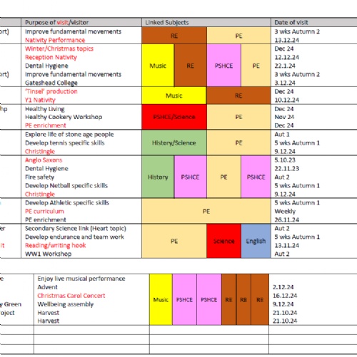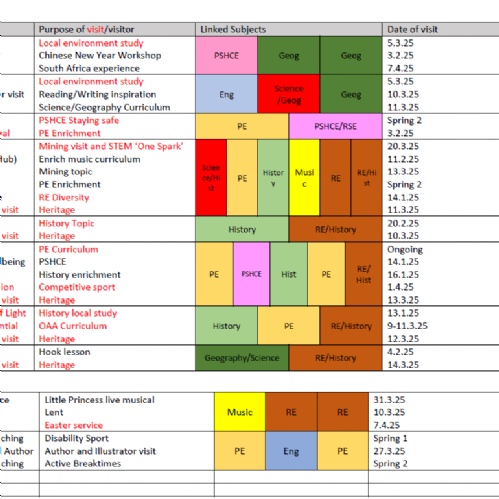 We have a strong belief that it is the experiences which our pupils experiences which will drive their passion for learning and ambitions for the future. By giving a broad range of learning experiences, our children benefit from learning from those with a huge range of knowledge and experiences to share, whilst also giving them a hook which draws them in to their topic or subject. The documents below show the wide range of experiences offered in the academic year 2024/25: