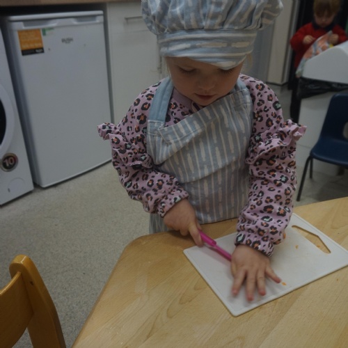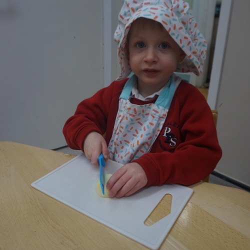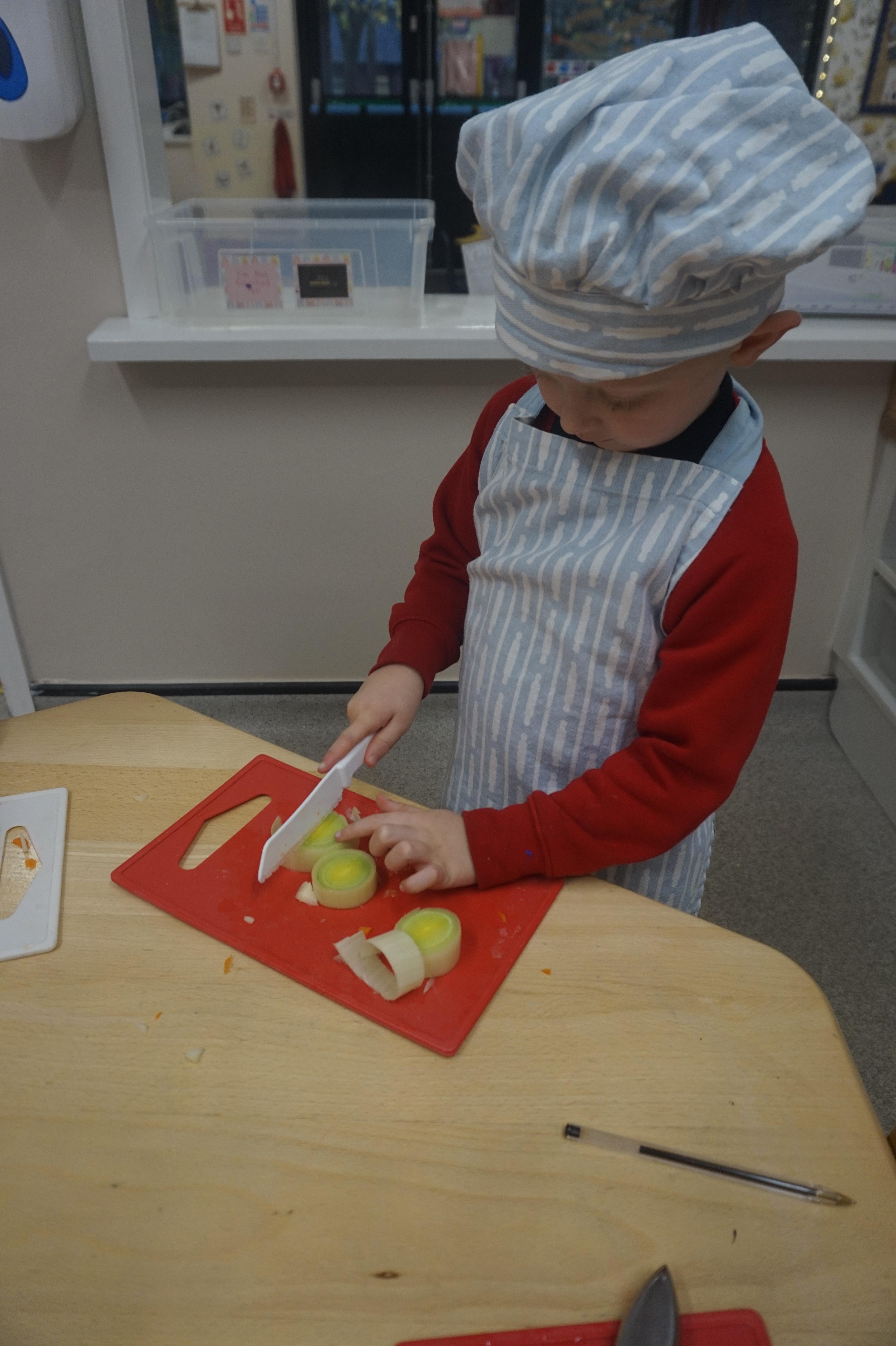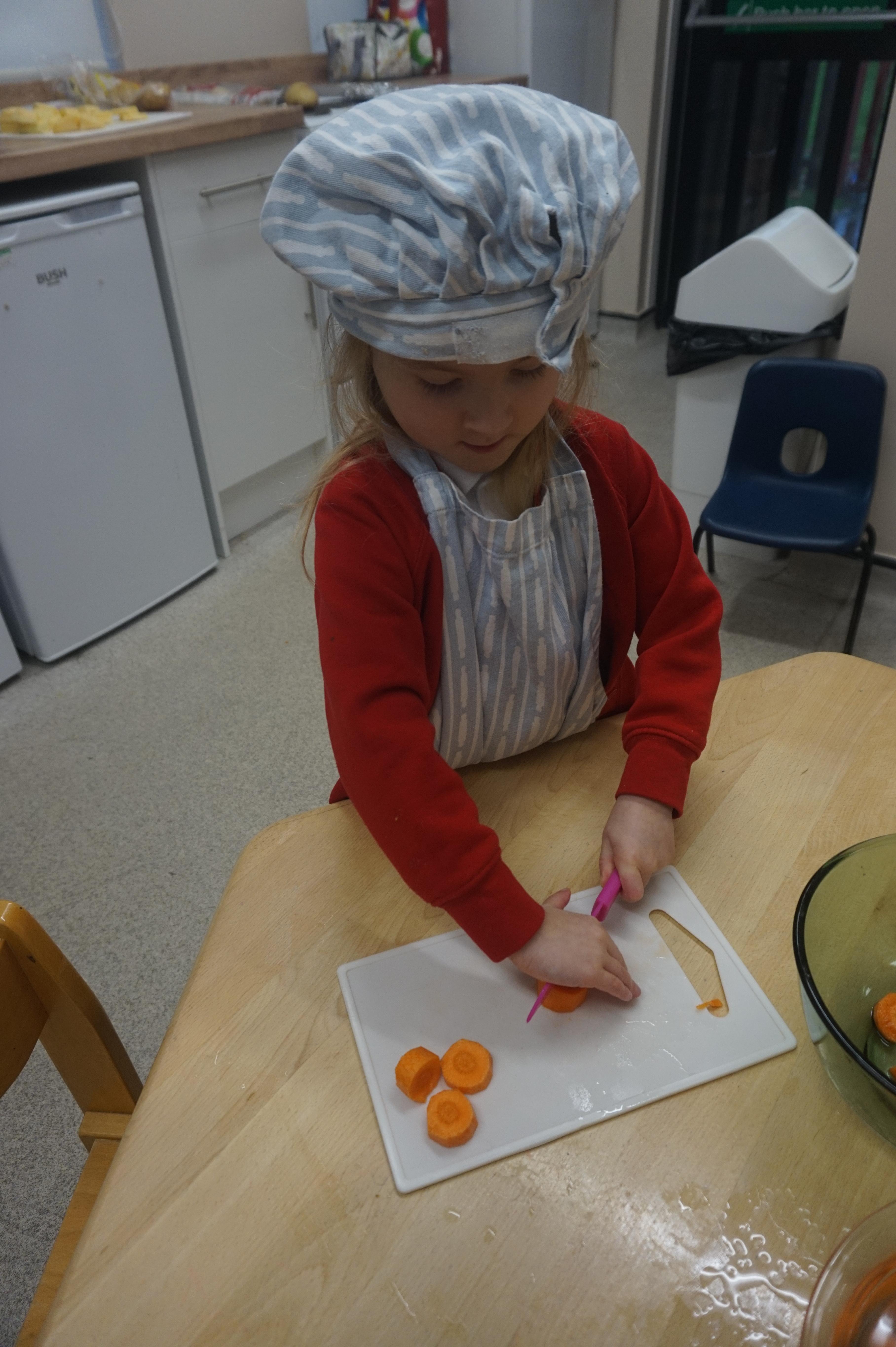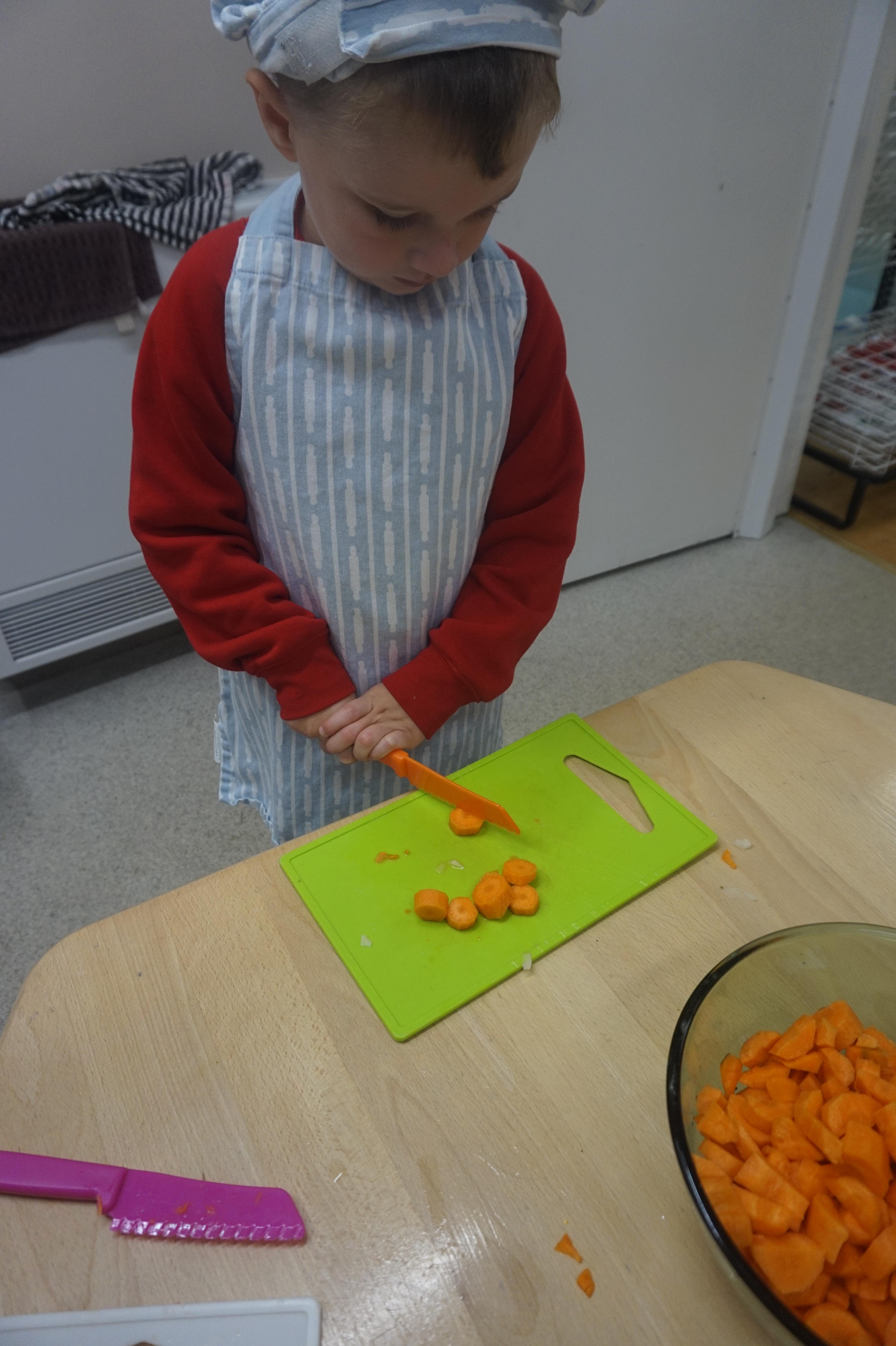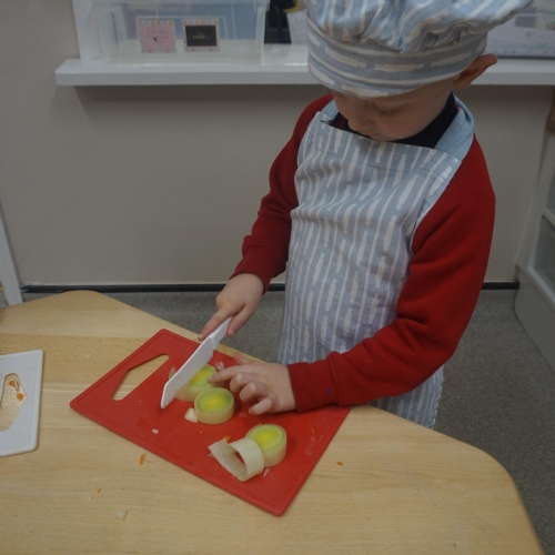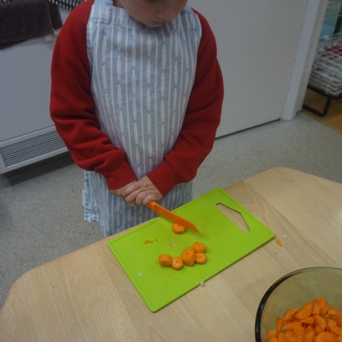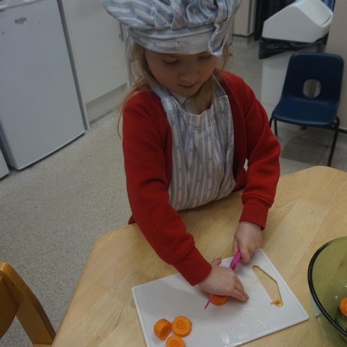 As part of our ‘Topic’ learning, we made our own vegetable soup. We learned where different food comes from and the job of a farmer. We then used our senses to explore some of the different vegetables. After that, we washed our hands and put our hats/aprons on. We then worked carefully to cut and prepare the vegetables for the soup. We learned about the key rules when using sharp objects, such as moving fingers out of the way, using the flat of your hand to apply further pressure and always watching what you are doing. We also learned that it was much easier to stand around the table. We found some of the vegetables were tougher than others to cut but we persevered and managed to cut them ourselves. We then enjoyed eating the soup for our snack!