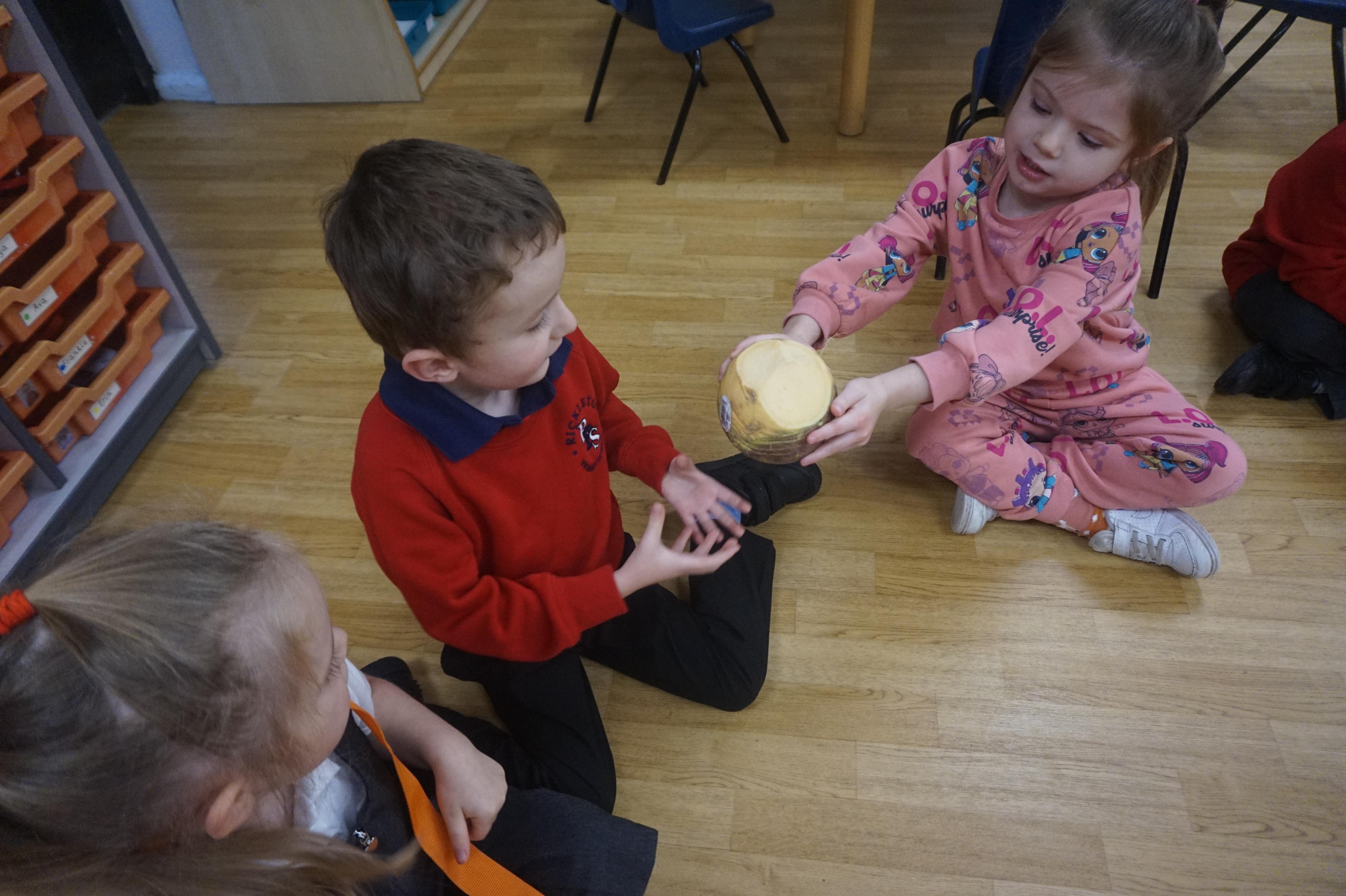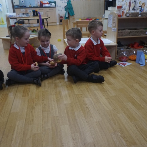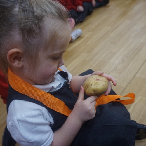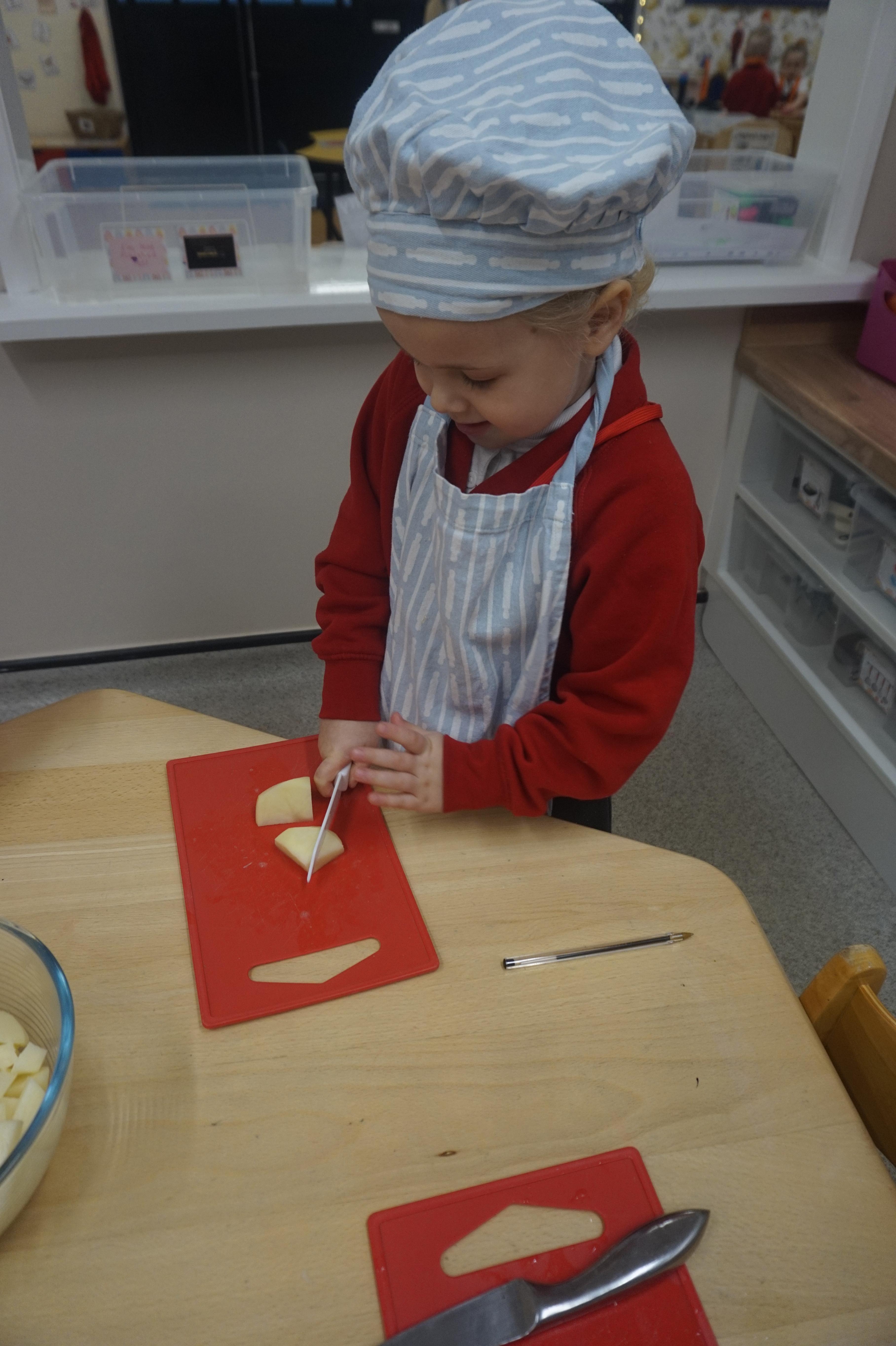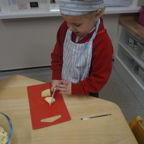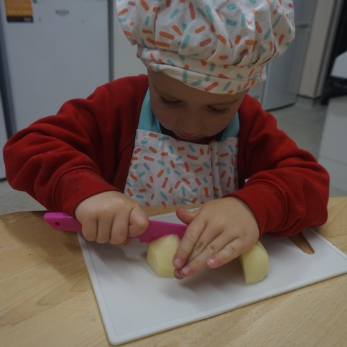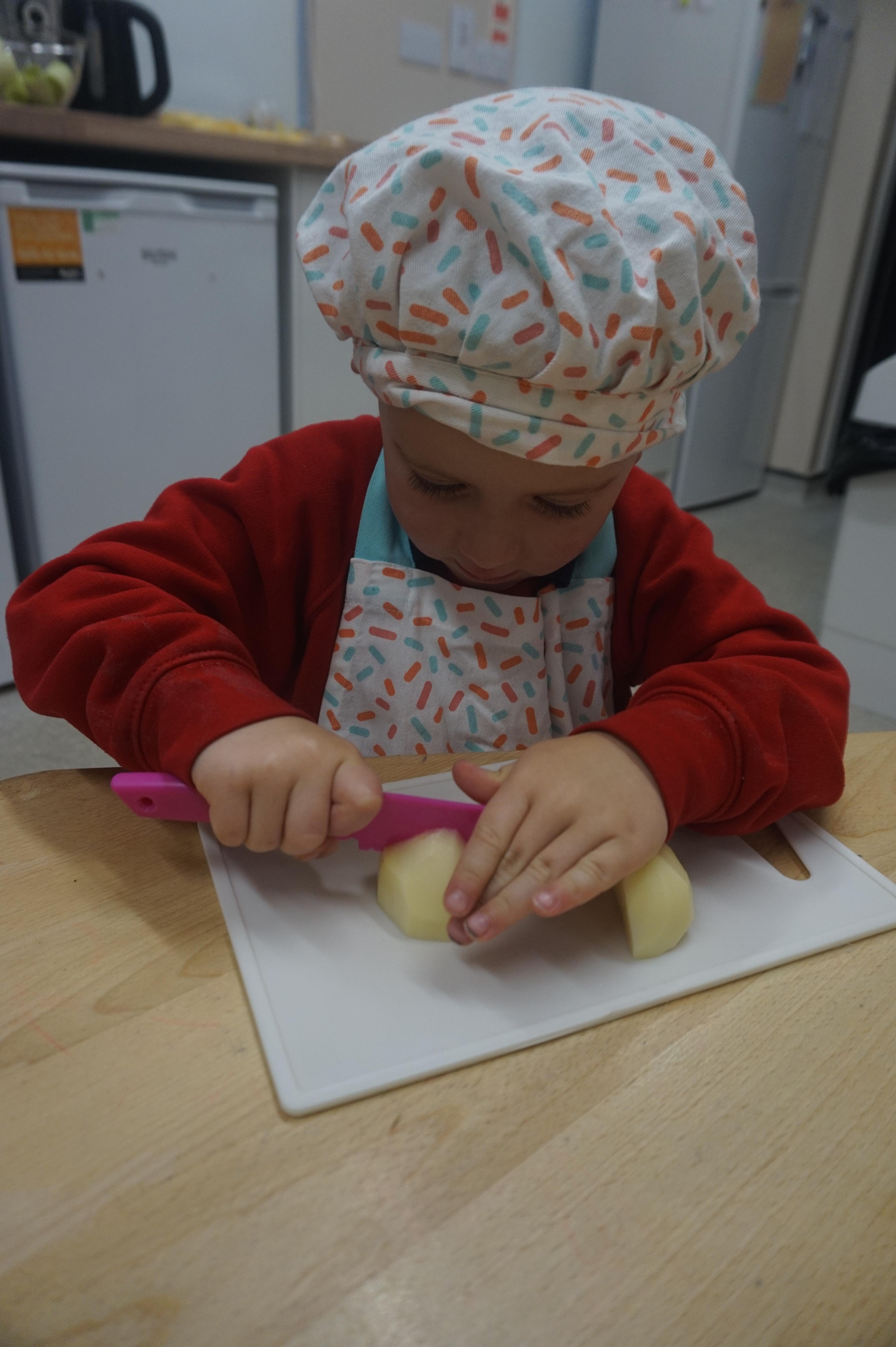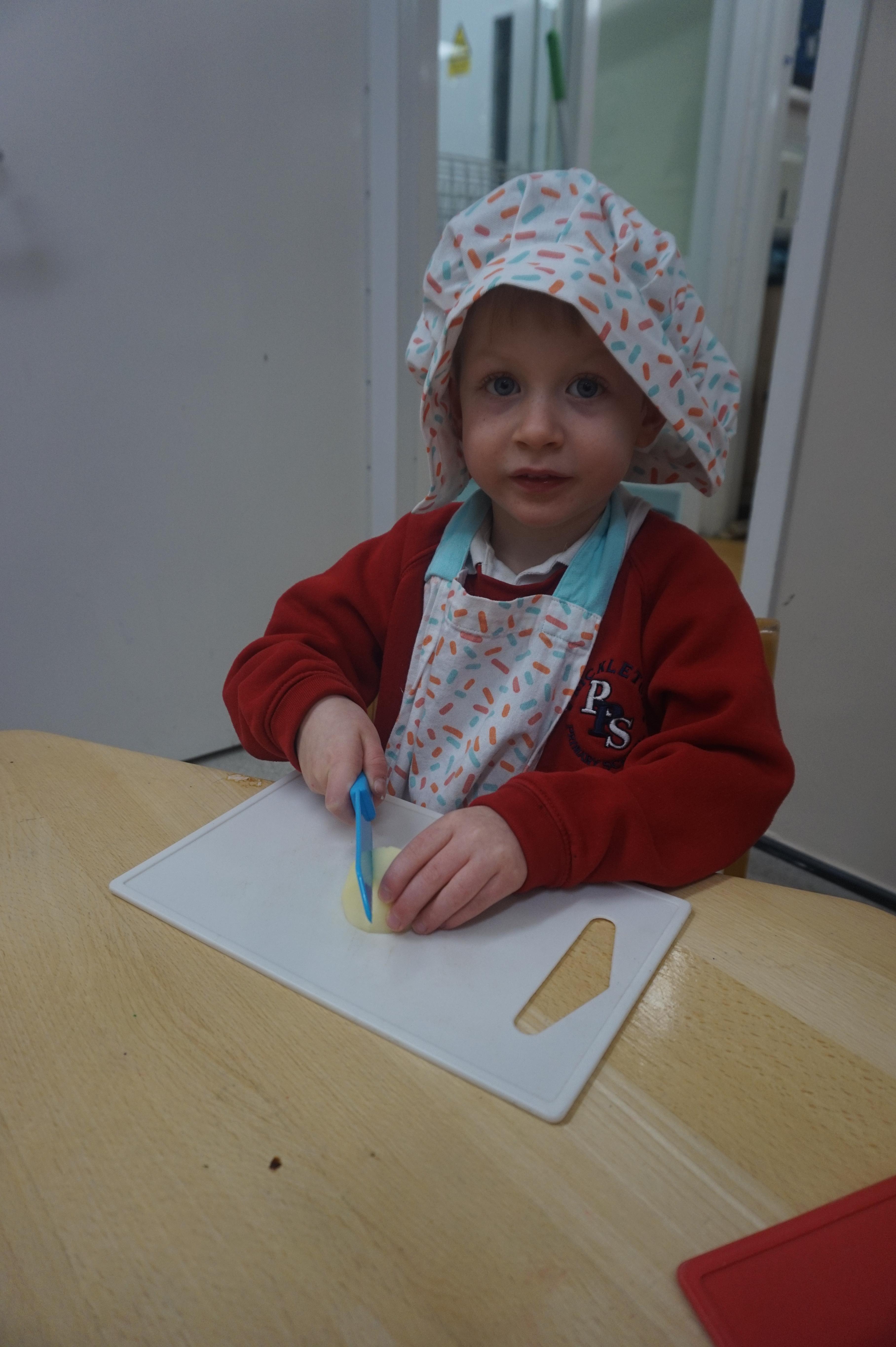 As part of our ‘Topic’ learning, we made our own vegetable soup. We learned where different food comes from and the job of a farmer. We then used our senses to explore some of the different vegetables. After that, we washed our hands and put our hats/aprons on. We then worked carefully to cut and prepare the vegetables for the soup. We learned about the key rules when using sharp objects, such as moving fingers out of the way, using the flat of your hand to apply further pressure and always watching what you are doing. We also learned that it was much easier to stand around the table. We found some of the vegetables were tougher than others to cut but we persevered and managed to cut them ourselves. We then enjoyed eating the soup for our snack!