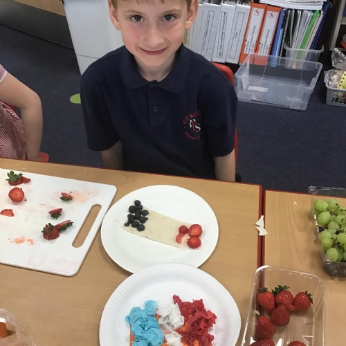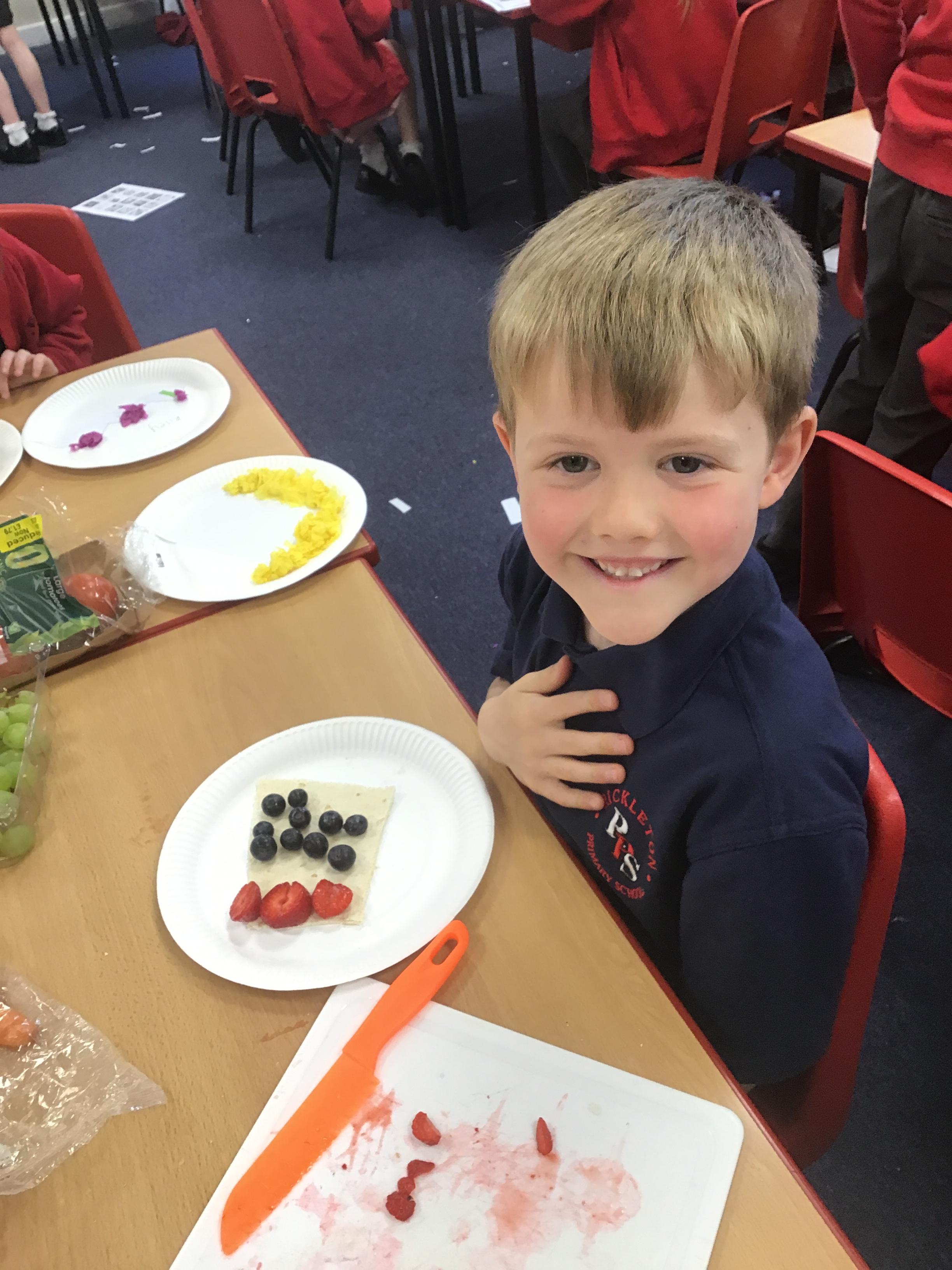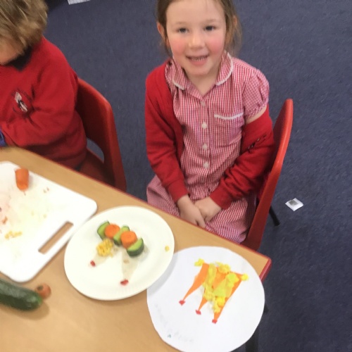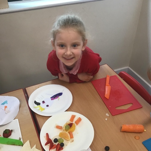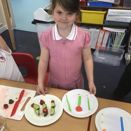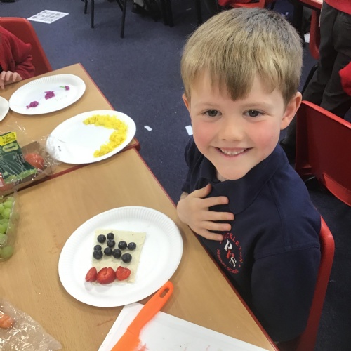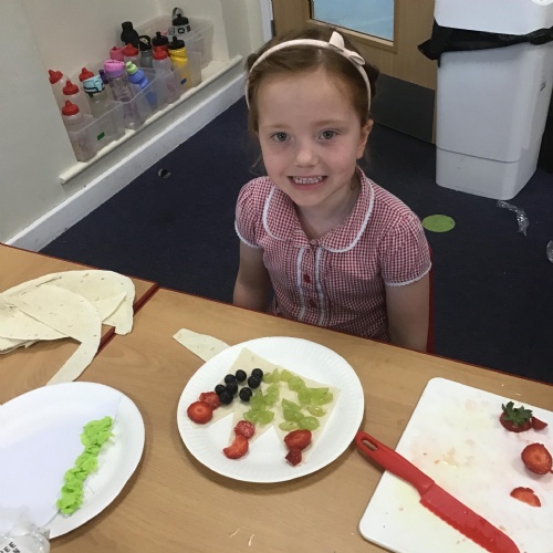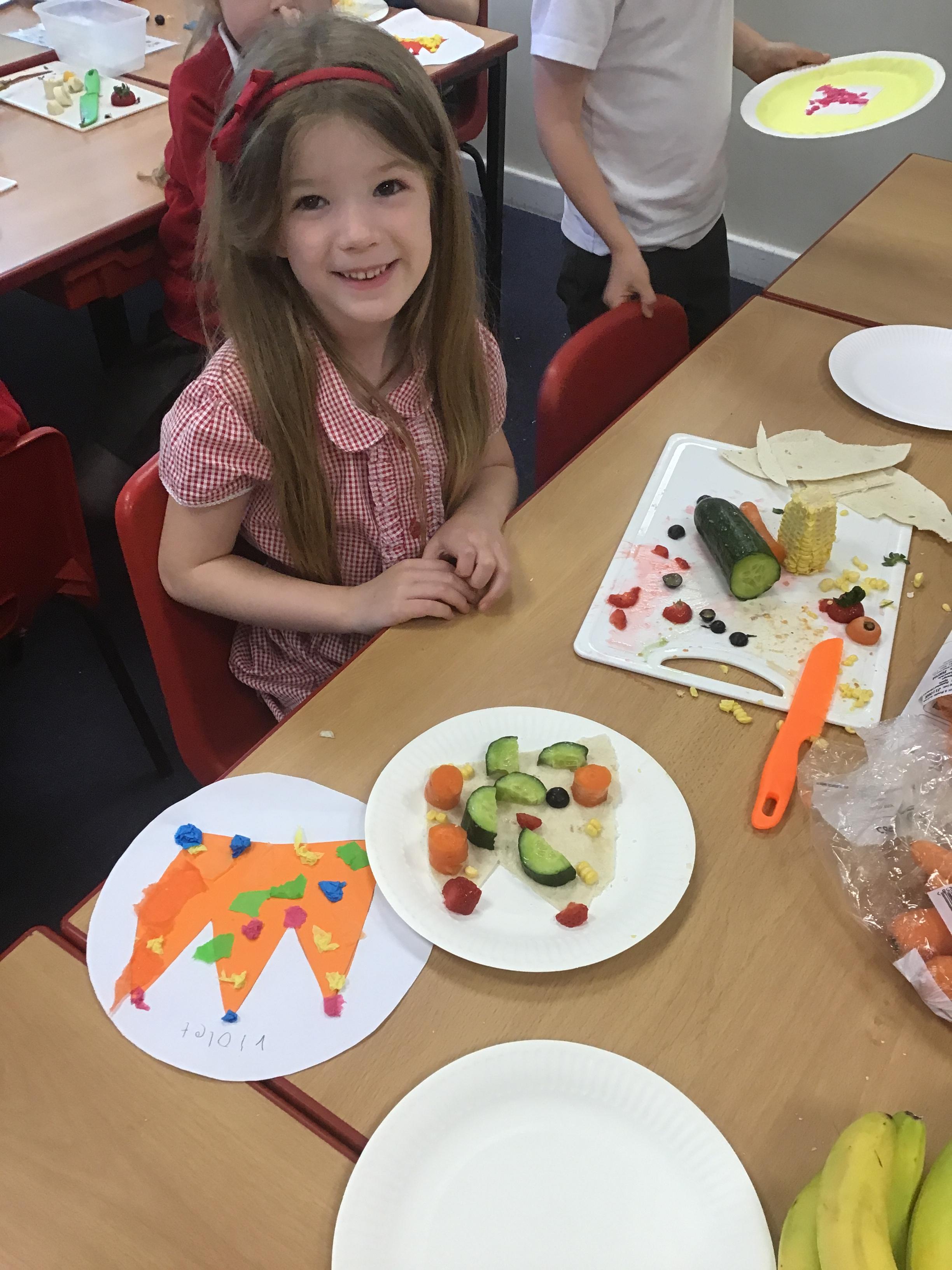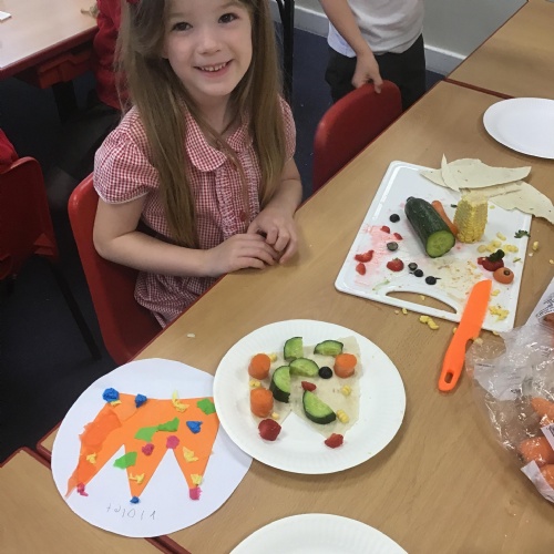 The children have been learning about the importance of eating 5 pieces of fruit and vegetables everyday as part of a balanced, healthy diet. They used their knowledge of healthy foods to design and then create their own Coronation inspired healthy snack using a range of fruit and vegetables.