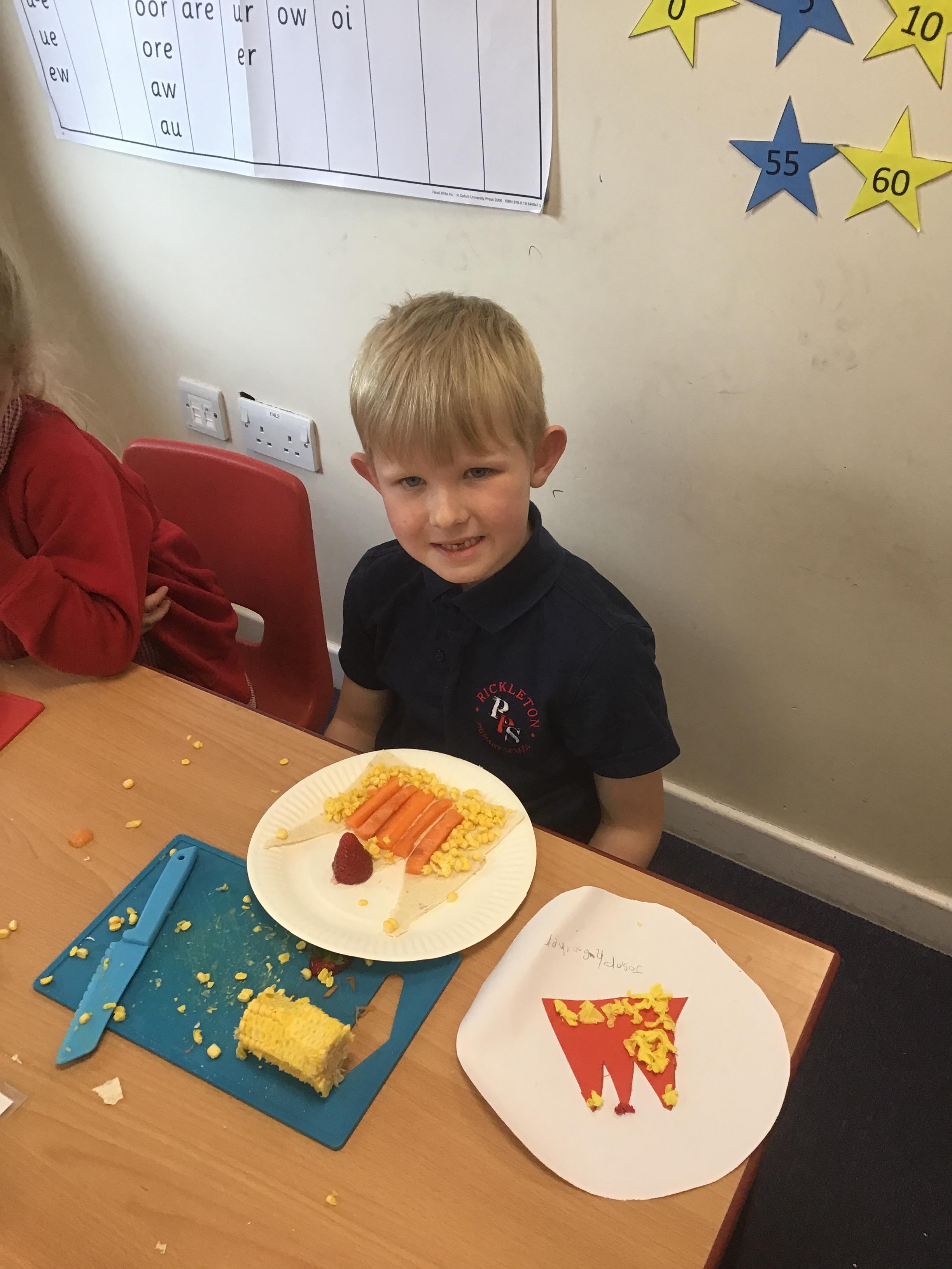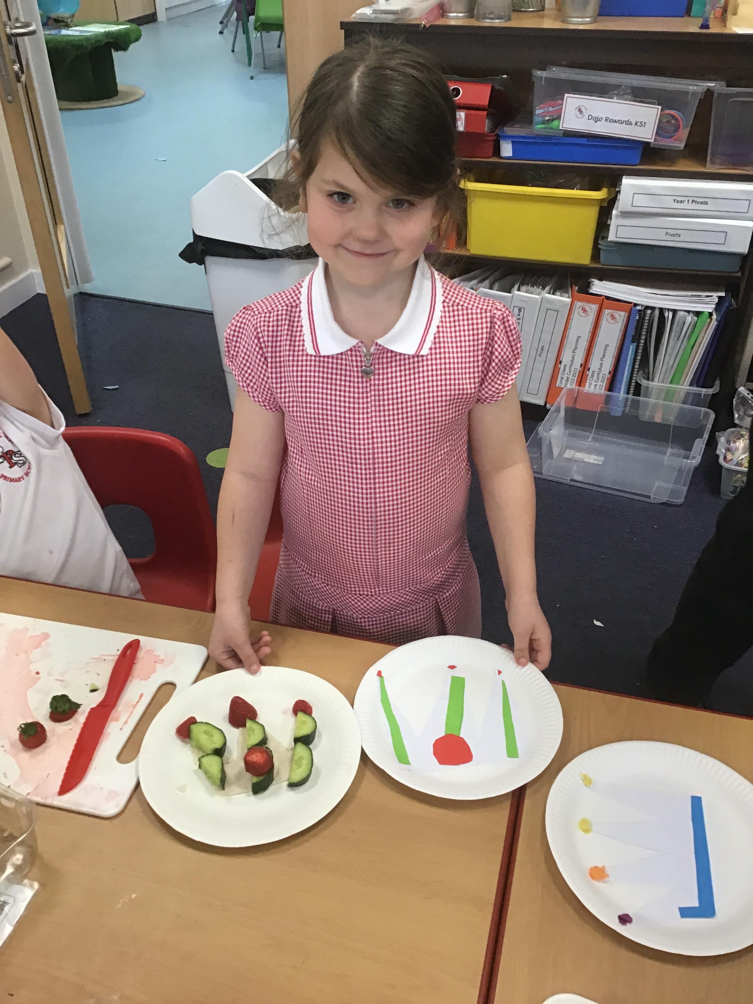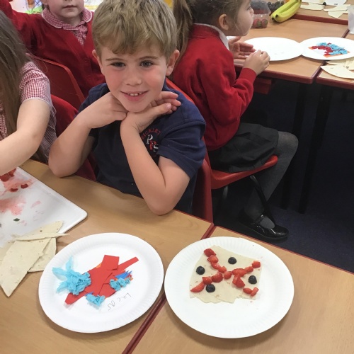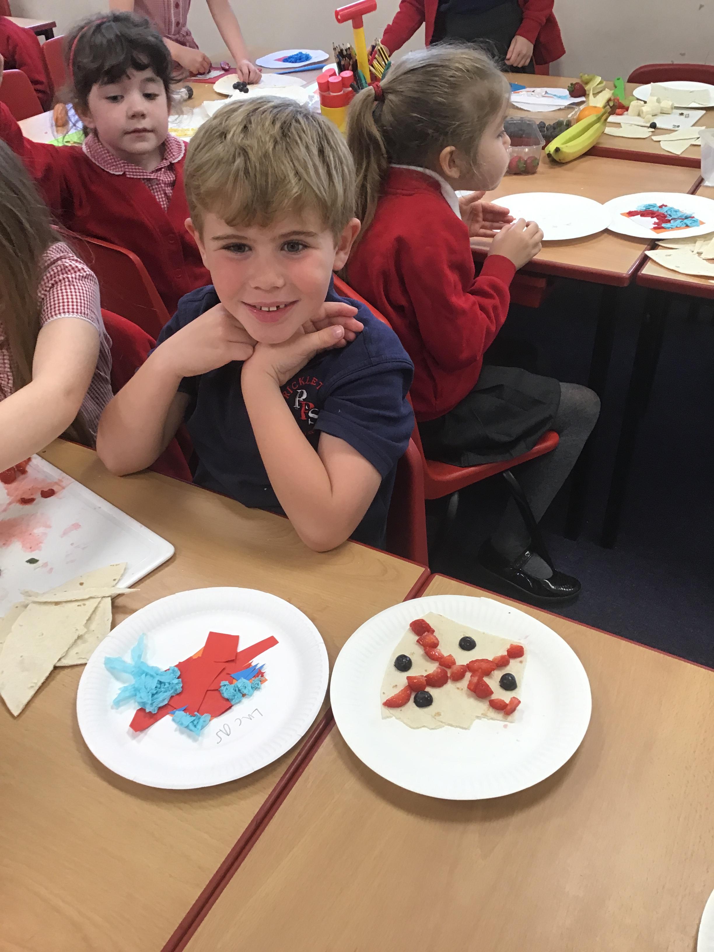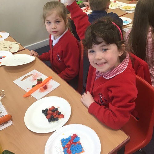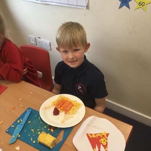 The children have been learning about the importance of eating 5 pieces of fruit and vegetables everyday as part of a balanced, healthy diet. They used their knowledge of healthy foods to design and then create their own Coronation inspired healthy snack using a range of fruit and vegetables.