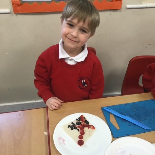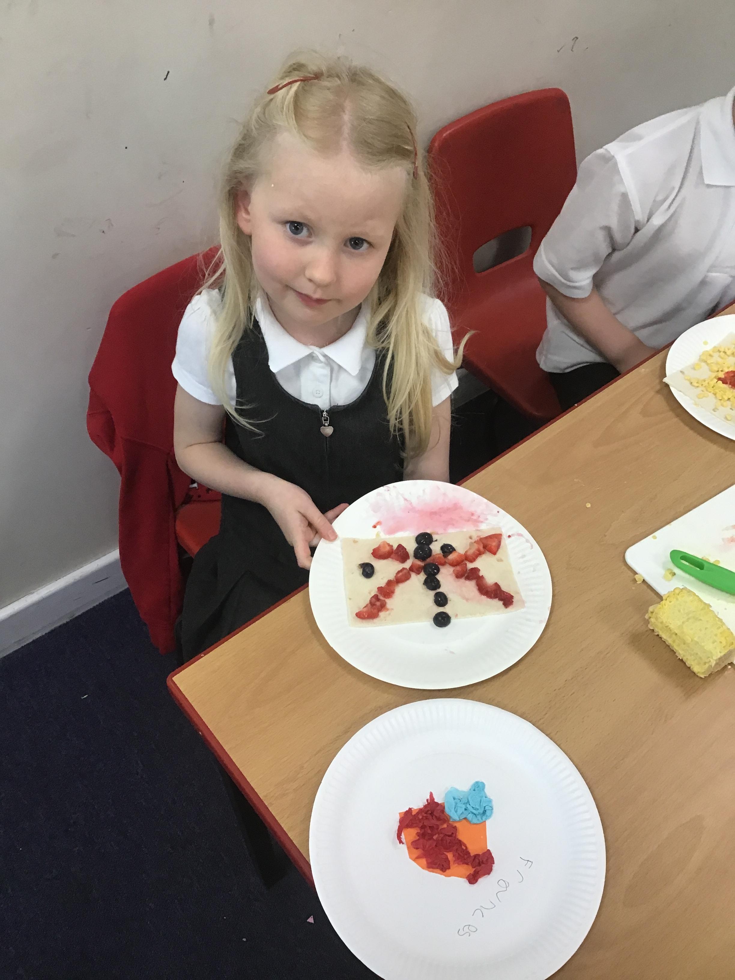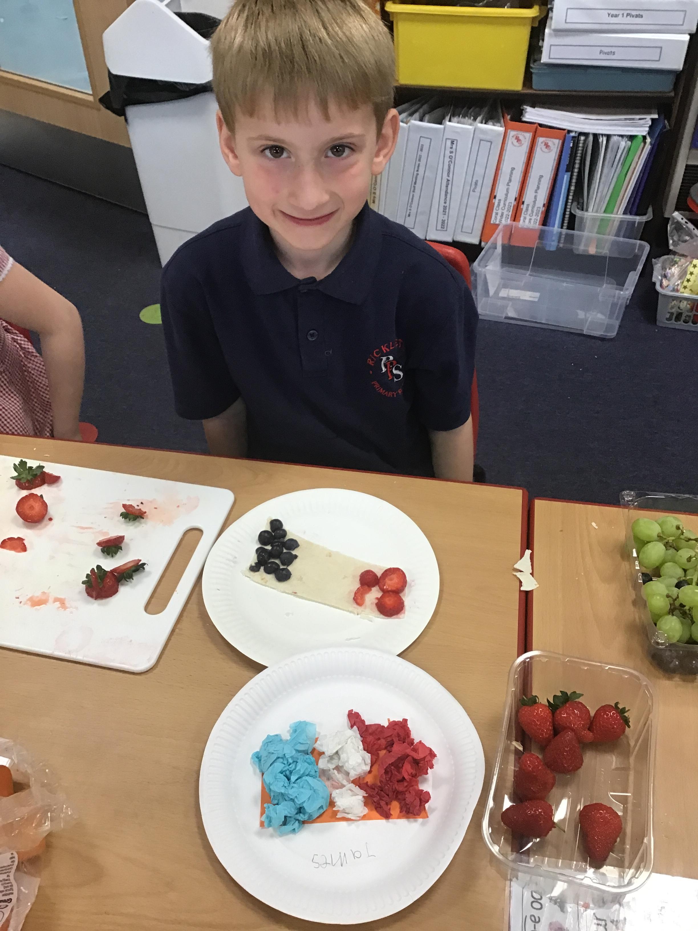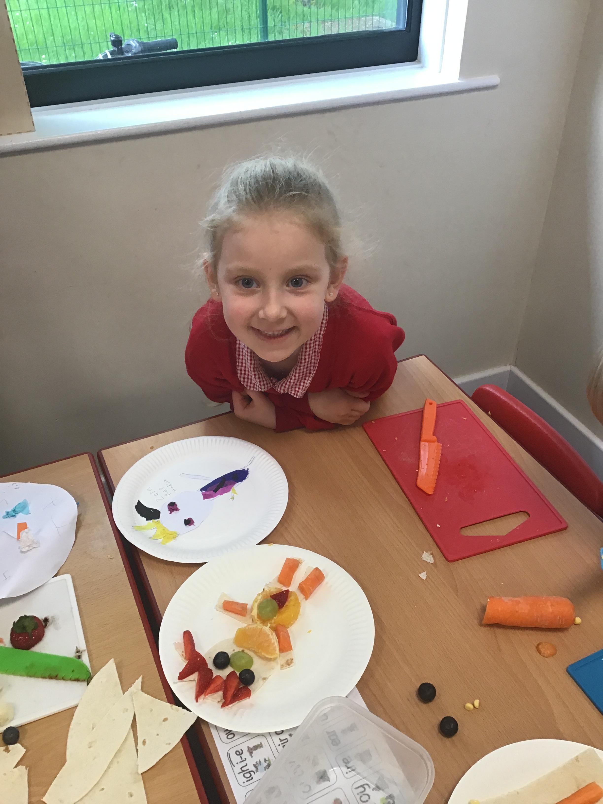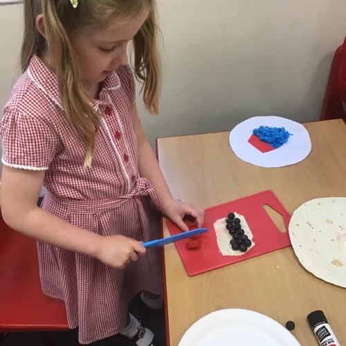 The children have been learning about the importance of eating 5 pieces of fruit and vegetables everyday as part of a balanced, healthy diet. They used their knowledge of healthy foods to design and then create their own Coronation inspired healthy snack using a range of fruit and vegetables.