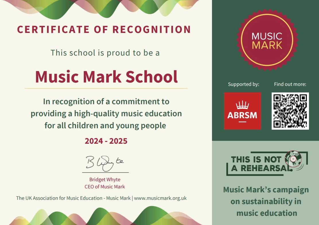 We are delighted that the high quality of musical education at our school has been recognised by the gaining of the school 'Music Mark. Throughout the academic year we will be continuing to provide high quality music education to all our pupils and are looking forward to expanding our opportunities for live performance.