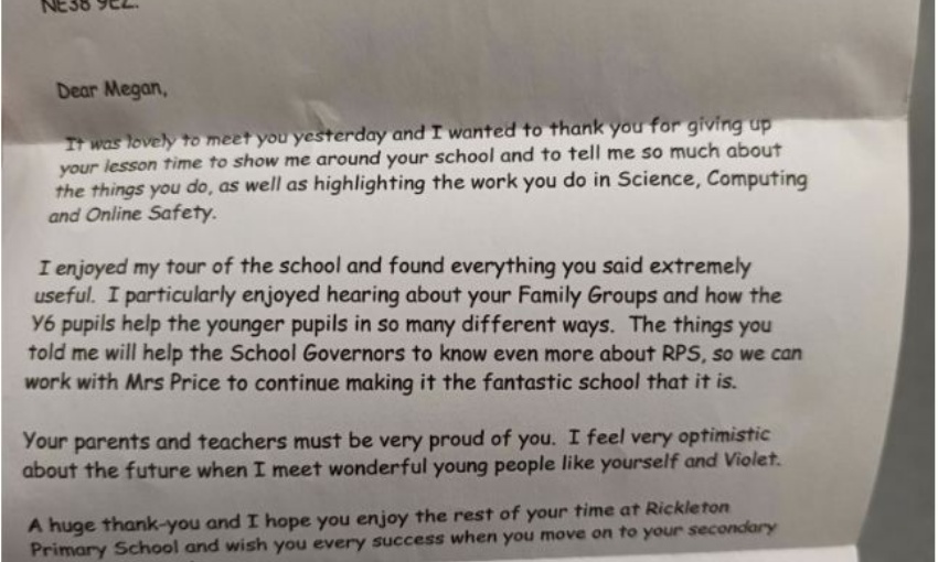 Six of our Y6 pupils have been doing guided tours of school for our governors as part of the planned monitoring activities which take place. Connie, Melody, Esme, Darcie, Violet and Megan have been absolutely amazing representatives for our school, resulting in one of the governors sending the lovely letter shown here. Well done girls!