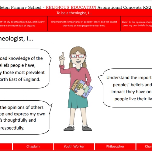 At Rickleton Primary, we follow the local SACRE RE curriculum. This is designed to support the needs of the local community and is tailored towards ensuring that the knowledge children gain is relevant to the context of living in the North East of England. The document below shows the progression of topics and teaching that children will encounter across their time in school.
