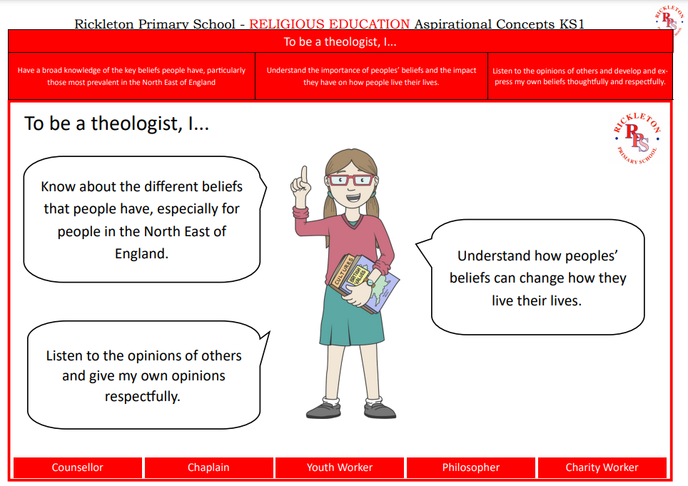 At Rickleton Primary, we follow the local SACRE RE curriculum. This is designed to support the needs of the local community and is tailored towards ensuring that the knowledge children gain is relevant to the context of living in the North East of England. The document below shows the progression of topics and teaching that children will encounter across their time in school.